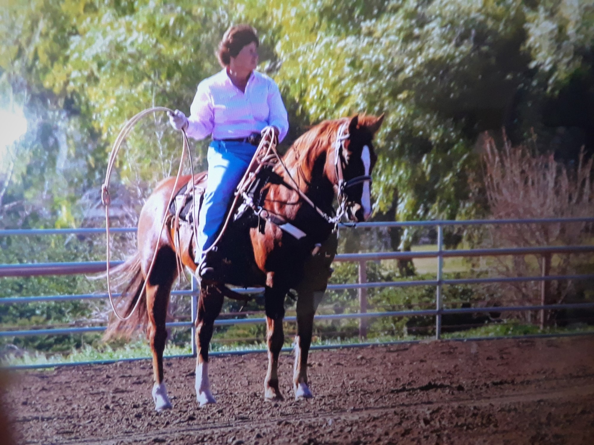 Dinero is one of Lori’s trusted Steeds! He is an all-around working ranch horse previously owned and trained vaquero style by Pete Spates using natural horsemanship. Dinero, is the type of horse that is well suited for working, he is agile and has a tremendous amount of endurance, very light and swift moving off your legs. He is “cowy” and enjoys his job cattle sorting, team penning, roping, and he is an awesome trail horse, from day rides to camping in the mountains. Lori and Dinero have a unique bond and connection making them an unbeatable team.